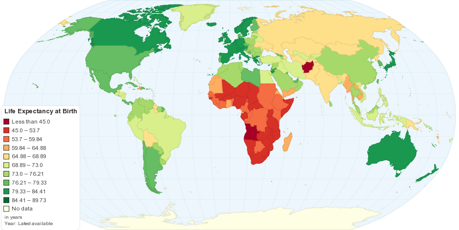 Citation: Current World Life Expectancy at Birth, ChartsBin.com, viewed 2nd December, 2024, <http://chartsbin.com/view/1356>.