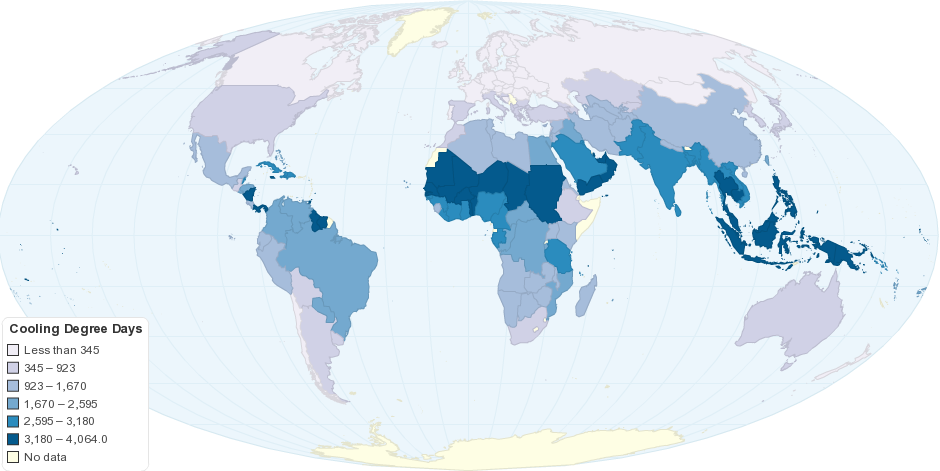 This map shows worldwide cooling degree days. Cooling degree day (HDD) is a measurement designed to reflect the demand for energy needed to cool a home or business to a human comfort level of 18 °C (65 °F).