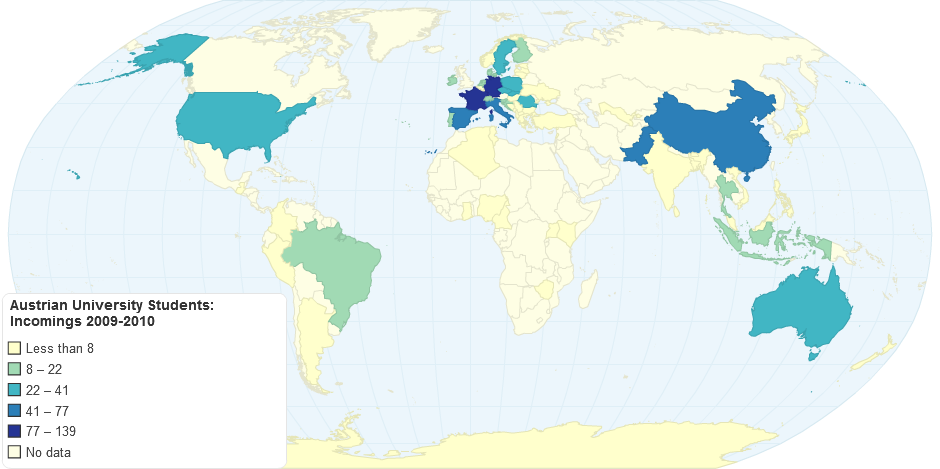 The map shows where external students (incomings) come from, who did an exchange semester at an Austrian University in the context of a funded exchange program in semester 2009/2010. The chart was generated based on data of the Austrian Ministry for Science and Research, purchased via uni:data.