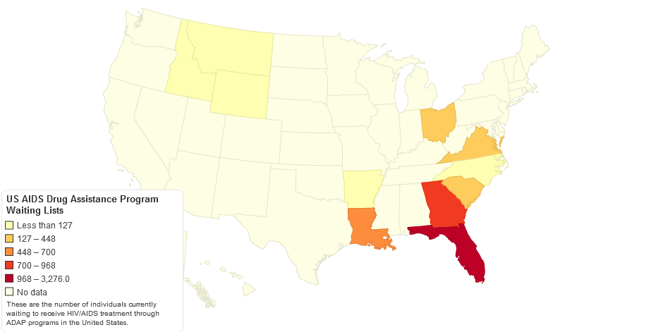 This map shows the number of individuals on state waiting lists for AIDS Drug Assitance Programs (ADAPs). ADAPs provide HIV medications to low-income people living with HIV/AIDS in the United States.
