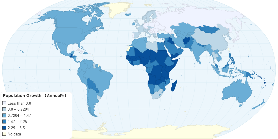 Population growth (annual %) is the exponential rate of growth of midyear population from year t-1 to t, expressed as a percentage.