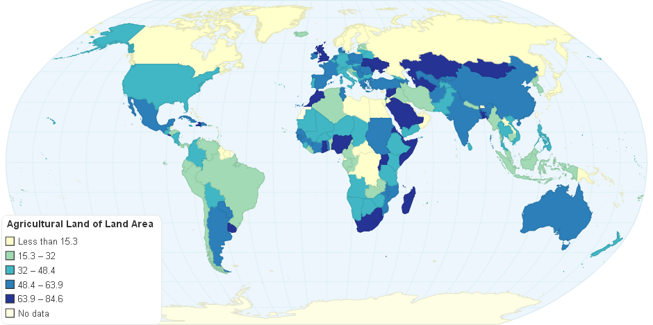 Agricultural land refers to the share of land area that is arable, under permanent crops, and under permanent pastures. Arable land includes land defined by the FAO as land under temporary crops (double-cropped areas are counted once), temporary meadows for mowing or for pasture, land under market or kitchen gardens, and land temporarily fallow. Land abandoned as a result of shifting cultivation is excluded. Land under permanent crops is land cultivated with crops that occupy the land for long periods and need not be replanted after each harvest, such as cocoa, coffee, and rubber. This category includes land under flowering shrubs, fruit trees, nut trees, and vines, but excludes land under trees grown for wood or timber. Permanent pasture is land used for five or more years for forage, including natural and cultivated crops.