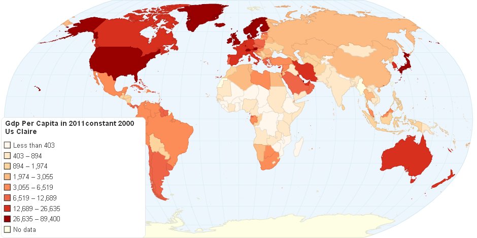 This is a map showing GDP per capita of countries in 2011 done by Claire.