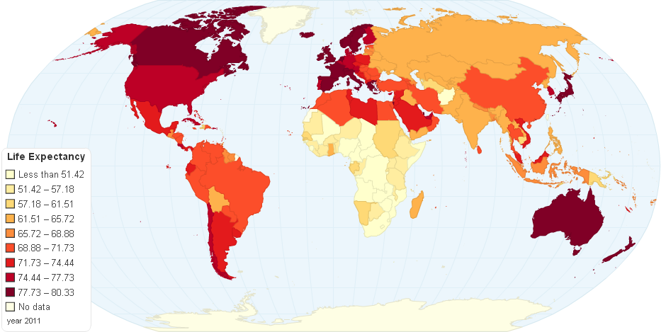 A map showing life expectancy on a global scale