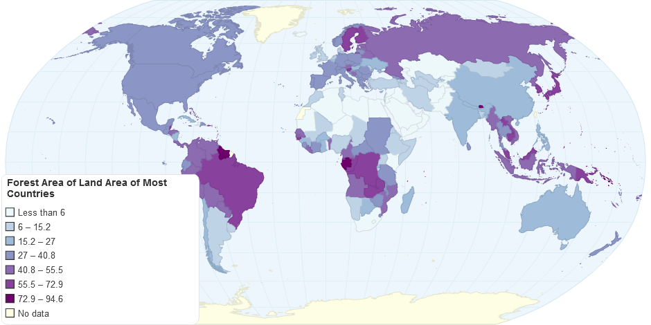 this shows the forest area(% of the land) of countries all over the world.