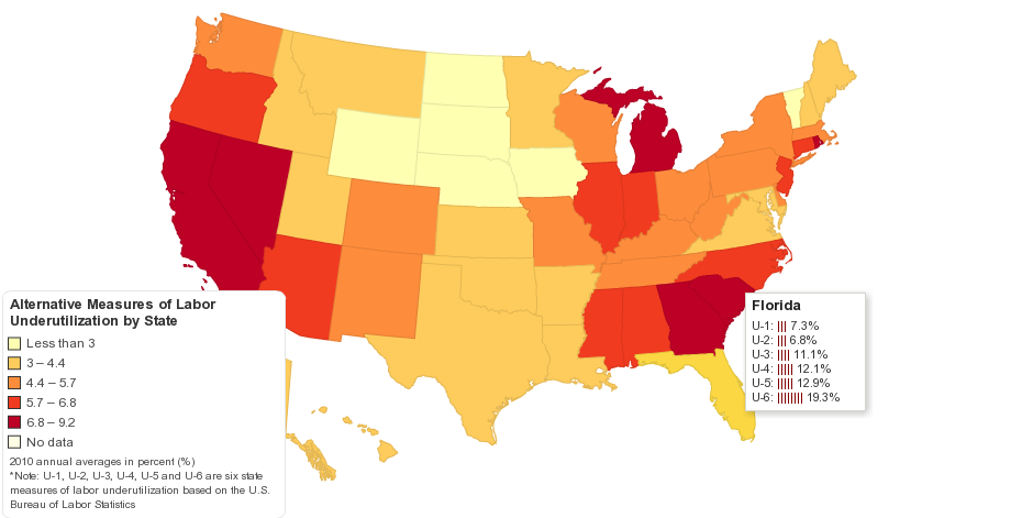 This map shows six alternative measures of labor underutilization for United States by state.