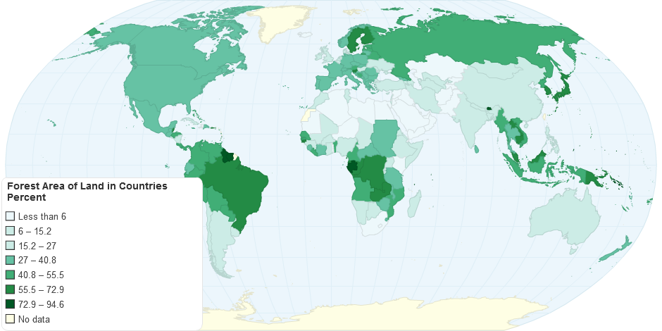 Forest Area of Land in Countries Percent