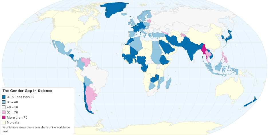 This map shows percentage of female researchers as a share of the worldwide total researchers. Researchers are defined as professionals engaged in the conception or creation of new knowledge, products, processes, methods and systems, as well as in the management of these projects