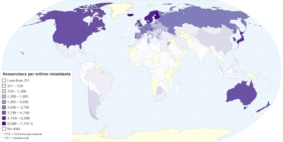 Number of Researchers per million inhabitants by Country