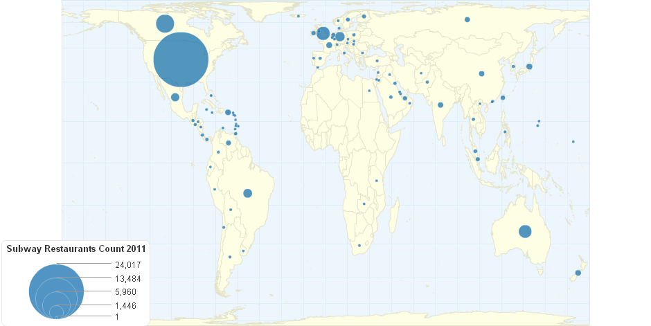 As of March 10th 2011 this is how many subway restaurants are in each country as per the subway website.