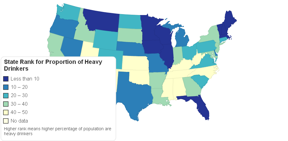 States with the highest proportion of heavy drinkers. Heavy drinking is defined as when women consume on average more than 1 drink per day and men consume on average more than 2 drinks per day.
