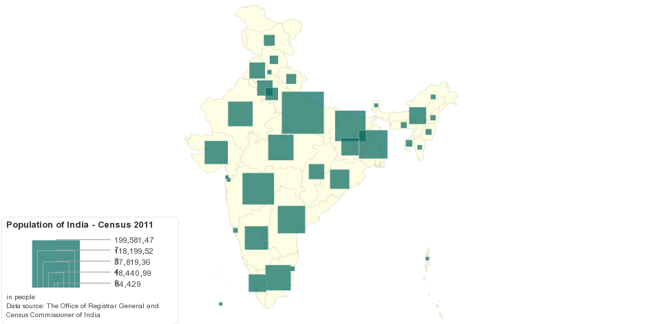 This map shows current population of India in 2011 census. Census 2011 is the 15th Census of India since 1872. Office of the Registrar General and Census Commissioner, India published provisional population totals for Census 2011 on 31-March-2011.
