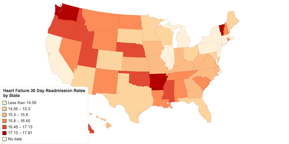 Pulled data from https://data.medicare.gov/dataset/Hospital-Outcome-Of-Care-Measures/f24z-mvb9 and then removed all entries with 'Not enough data.' Then back-calculated total number of patients by mortality rate ([numer deceased]/[mortality rate]). Broke down the data by state and calculated the readmit rate: [# of patients readmitted]/[total # of patients – # of patients deceased]. The numbers from these calculations were in general significantly lower than those reported by the healthcare organizations, so use data at your own discretion. These data were pulled in January 2013