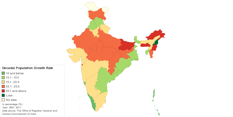 - During 2001-2011, as many as 25 States/UTs with a share of about 85% of the country's population registered an annual growth rate of less than 2% as compared to, 15 States/UTs with a share of about 42% during the period 1991-2001.