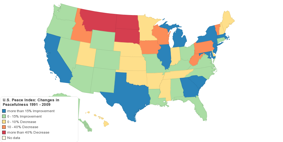 This map shows U.S. Peace Index: Changes in Peacefulness 1991 - 2009.
