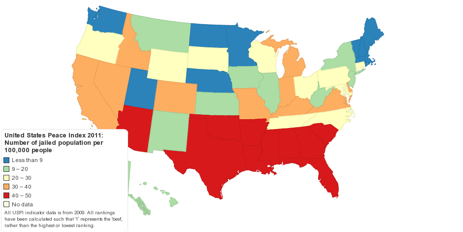 Number of jailed population per 100,000 people rank is one of the five indicators use to produce United States Peace Index.