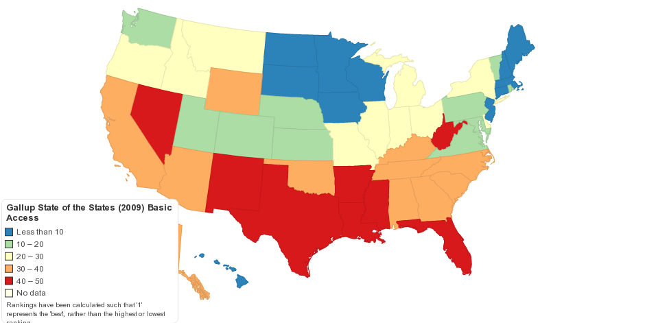 This map shows Gallup State of the States (2009) Basic Access rank.