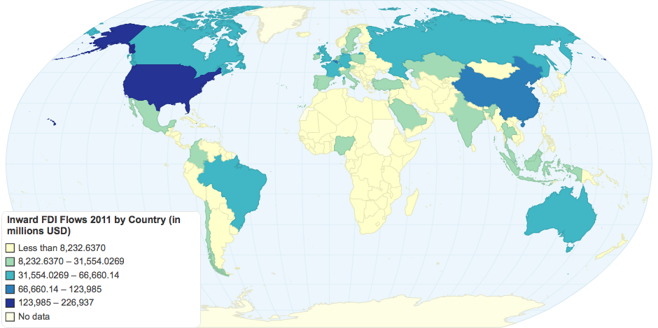 World map of inward FDI inflows in 2011, according to UNCTAD database. Map realized for a class on FDI. © Marion Cochet