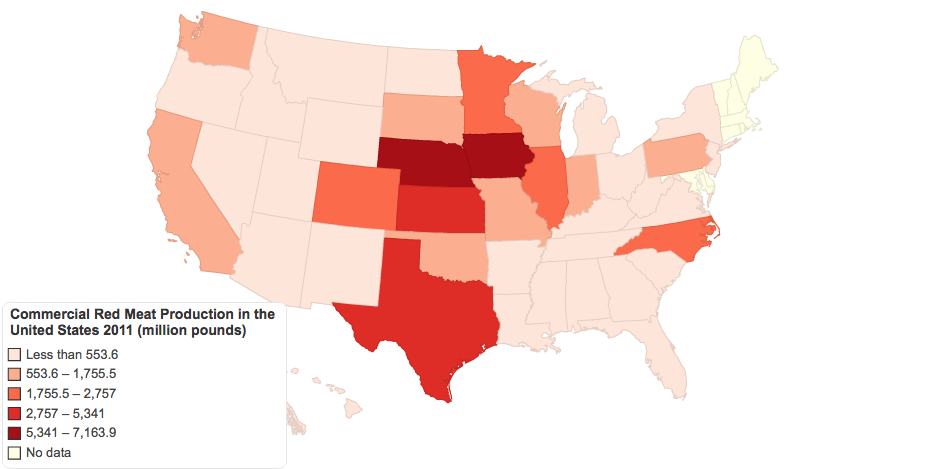This chart shows the red meat production for each state in 2011. Source: USDA, National Agricultural Statistics Service, "Livestock Slaughter 2011 Summary." The following states are aggregated as "New England" in the 2011 Summary and have a cumulative red meat production of 17.4 million pounds: Maine, Vermont, New Hampshire, Connecticut and Rhode Island.