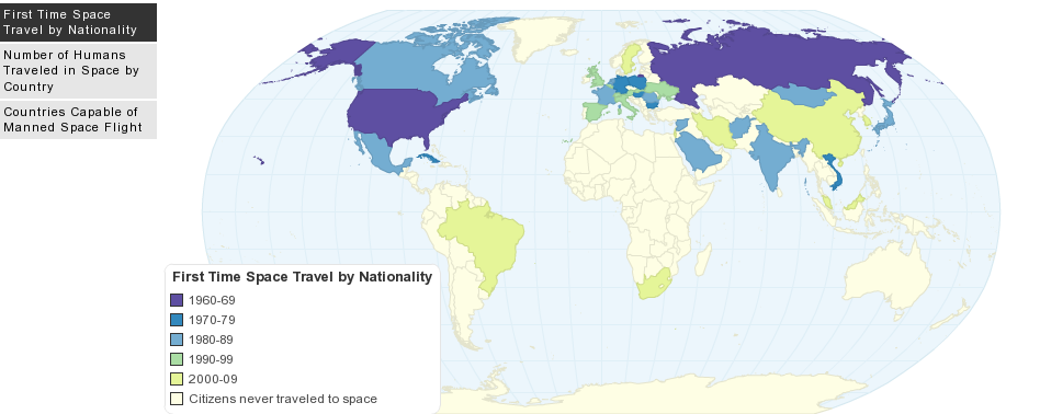Since the first human spaceflight by the Soviet Union (12 April 1961), citizens of 38 countries have flown in space. For each nationality, the launch date of the first mission is listed. The list is based on the nationality of the person at the time of the spaceflight. Only three of the thirty-eight "first flyers" have been women (Sharman in 1991, Ansari in 2006, Yi in 2008).