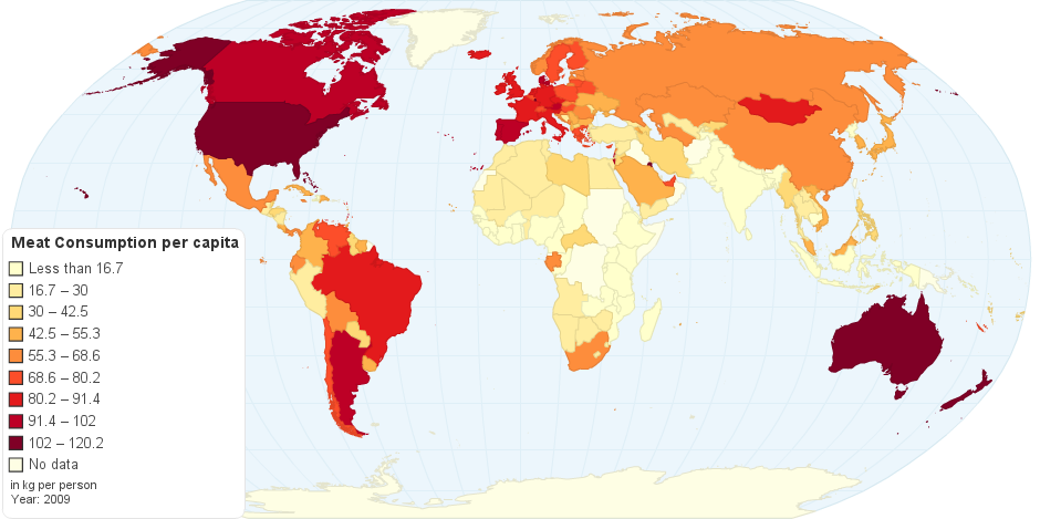 This map shows current worldwide annual Meat Consumption per capita.