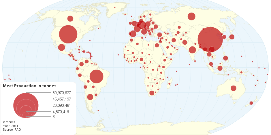 This map shows current worldwide annual Meat Production in tonnes per country.