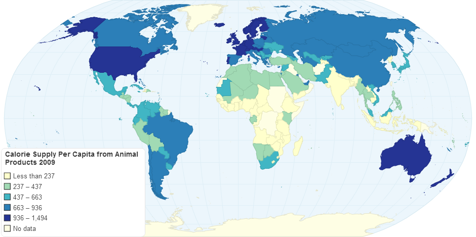 This map refers to the amount of available food from animal products, expressed in calories per person, per day. Animal products include: all types of meat and fish; animal fats and fish oils; edible offal; milk, butter, cheese, and cream; and eggs and egg products.