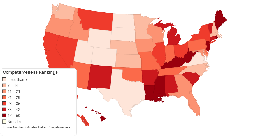 Competitiveness Rankings, CNBC - America's Top States for Business 2012; Forbes - Best States for Business; Beacon Hill Institute State Competitiveness Report; Small Business & Entrepreneurship Council - U.S. Business Policy Index; 2012 University of Nebraska - State Entrepreneurship Index, viewed 16th April, 2013.