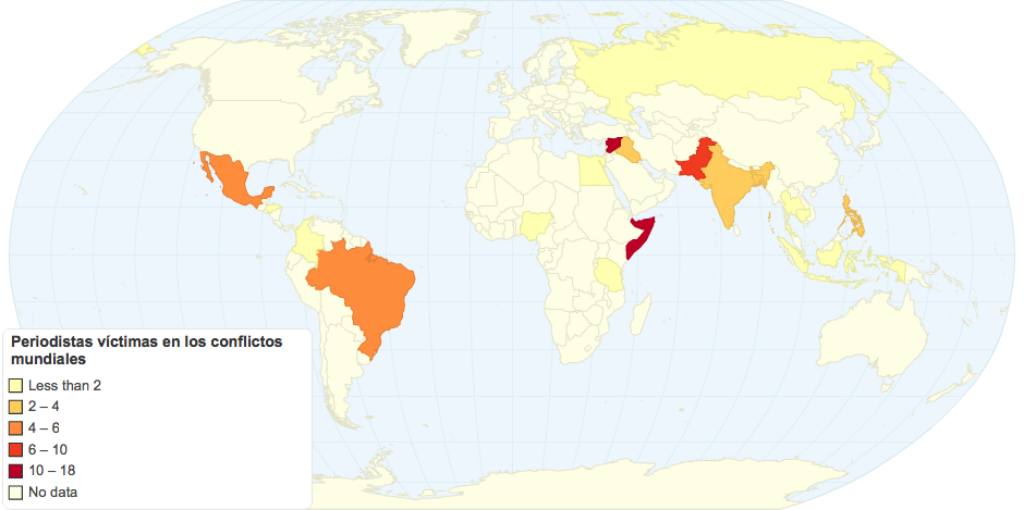 Información recogida por el Informe Anual de Reporteros sin Fronteras que muestra a los profesonales del periodismo que hayan fallecido en los distintos conflictos mundiales dividido por paises.