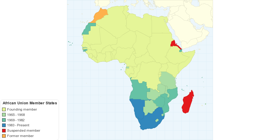 The African Union (AU) established in 1963 as the Organization of African Unity (OAU) to eradicate colonialism and improve economic, cultural, and political cooperation in Africa. Its headquarters are in Addis Ababa, Ethiopia. It comprises 53 members representing virtually the whole of central, southern, and northern Africa. The AU, which replaced the OAU in July 9, 2002, loosely based on the European Union (EU), aims to promote cooperation and integration among the independent nations of Africa. More economically based than its predecessor, its vision includes an integrated economy.