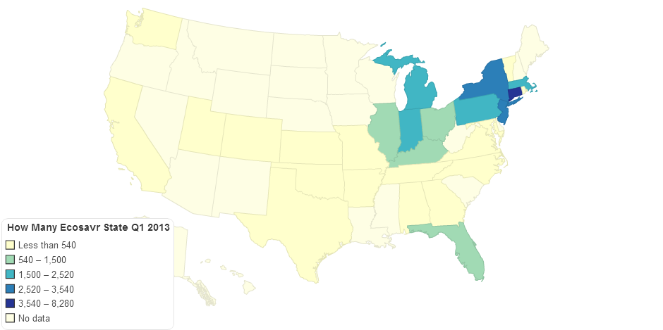 An interactive map of the number of Ecosavr shipped out in Q1 of 2013, and to which state they were sent. Do these numbers surprise you?