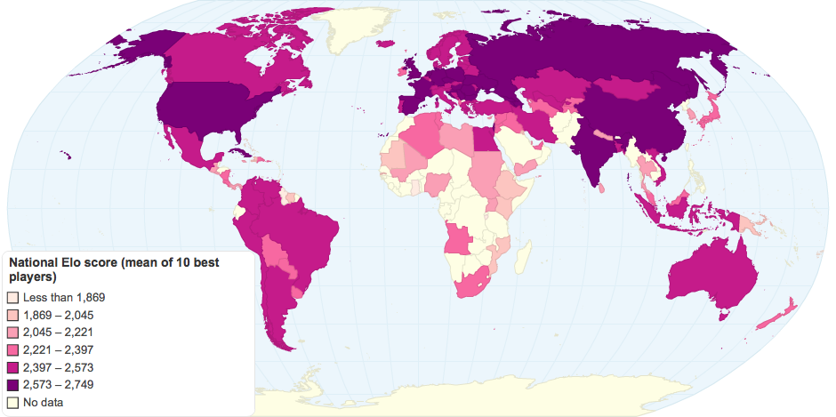 Countries are ranked by averaging the Elo ratings of each country's 10 best chess players.