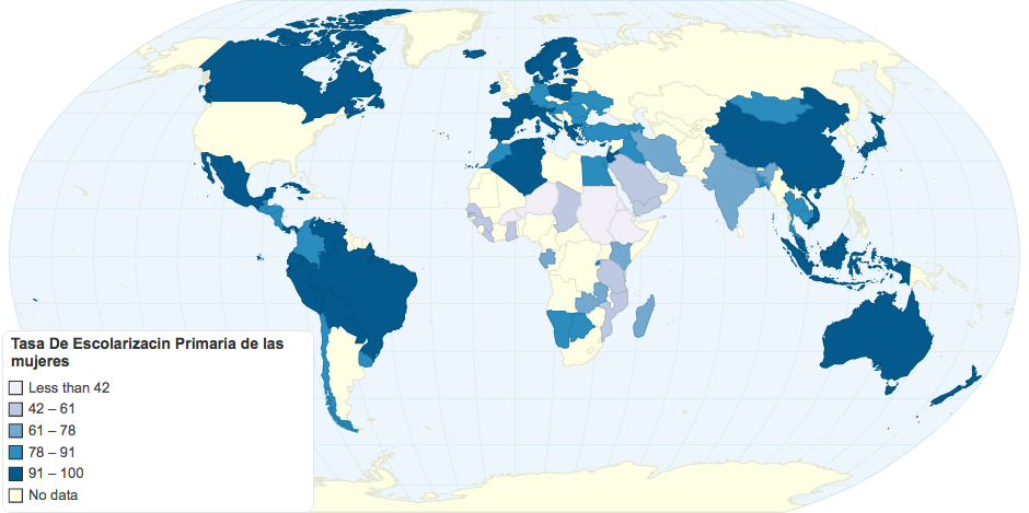 Este mapa representa la tasa de escolarizacion primaria de las mujeres de 111 paises.