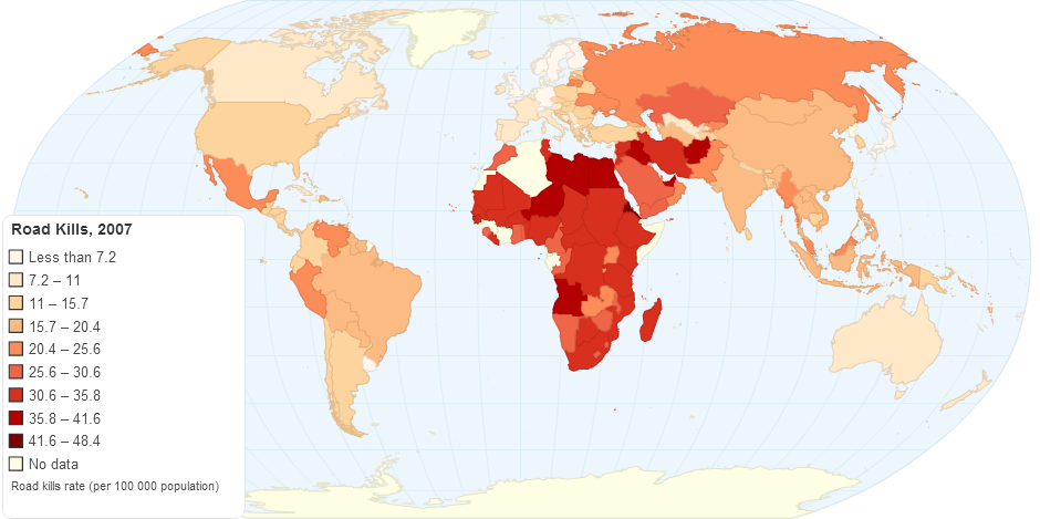 Road kills, and road kills rate (per 100 000 population) in the world.