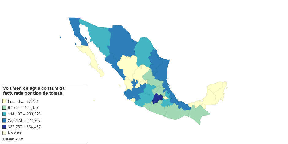 Volumen de agua consumida facturada por tipo de tomas durante 2008, http://www3.inegi.org.mx/sistemas/sisept/default.aspx?t=mamb307&s=est&c=33151, viewed 7th June, 2013.