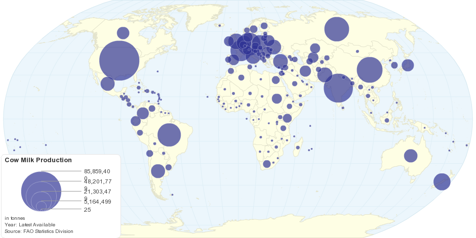 This map shows current worldwide Cow milk (whole, fresh) production.