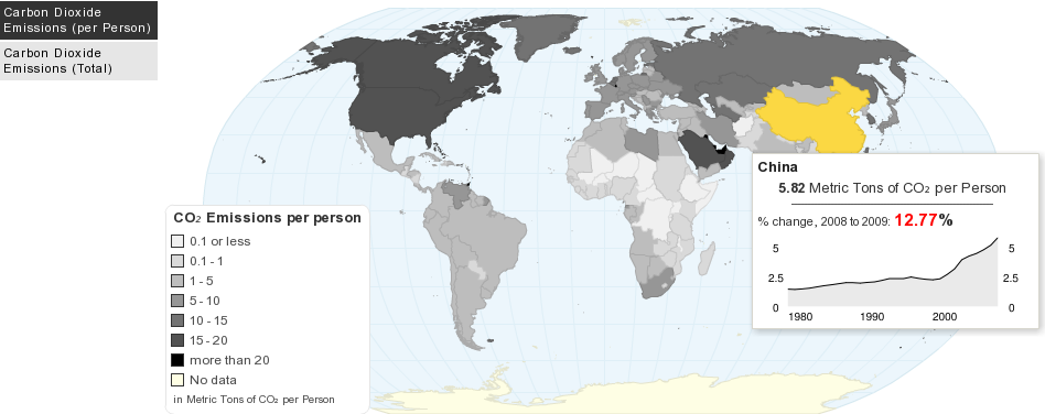 This maps shows current worldwide carbon dioxide(CO₂) emissions and per capita emissions from the consumption of energy. Data includes emissions due to the consumption of petroleum, natural gas, and coal, and also from natural gas flaring. These emissions lead to the greenhouse effect when heat energy is trapped by gases in the atmosphere, raising temperatures and producing global warming.
