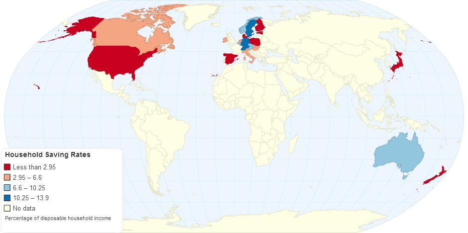 A look at what percentage of money people save around the world, according to the OECD's Percentage of disposable household income measurement.