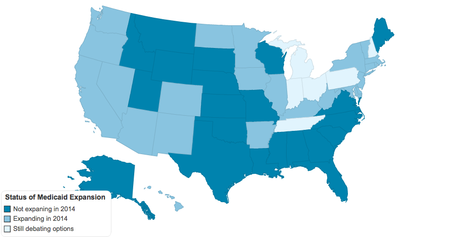 Status of Medicaid expansion, Kaiser Family Foundation, Kff.org, Status of State Action on the Medicaid Expansion Decision, as of July 1, 2013, viewed 16th July, 2013.