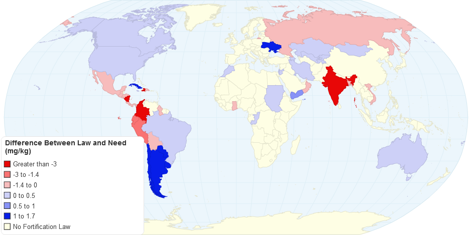 Folic Acid fortification gap between mandatory laws and delivered amounts.