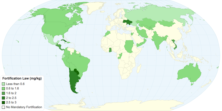 A map showing the level of fortificaion required by law to fortify wheat with folic acid.