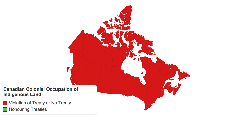 Map of Provinces currently in violation of treaties, or without treaties, with Indigenous Nations.