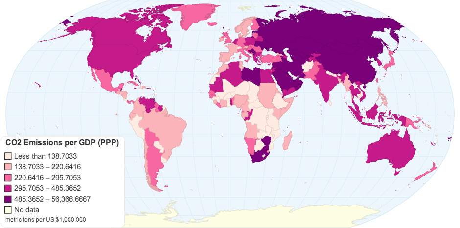 Metric tons of CO2 emitted per million dollars (US, PPP) of economic output