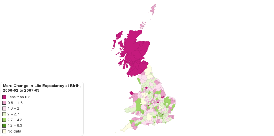 This map shows Men change in life expectancy at birth by United Kingdom Local authority, 2000-02 to 2007-09.