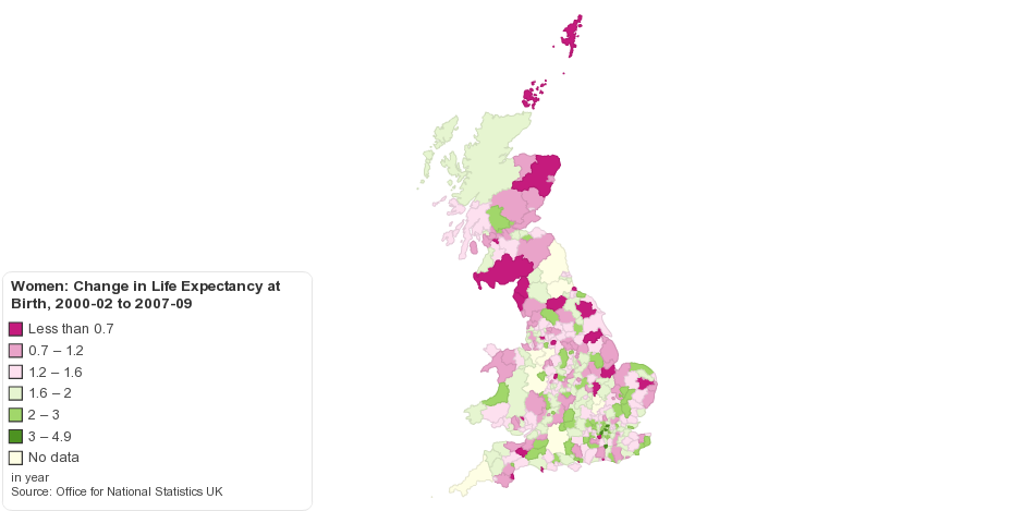 This map shows Women change in life expectancy at birth by United Kingdom Local authority, 2000-02 to 2007-09.