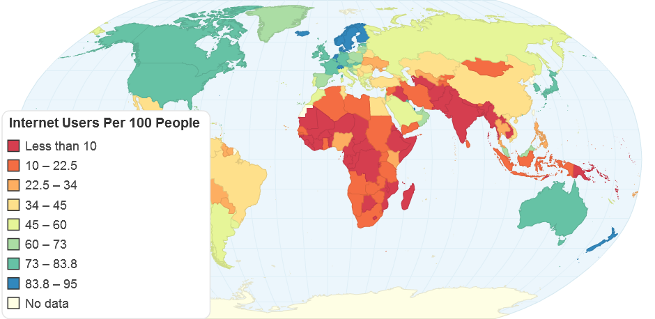 Map showing the amount of internet users by every country. Data from the World Bank.