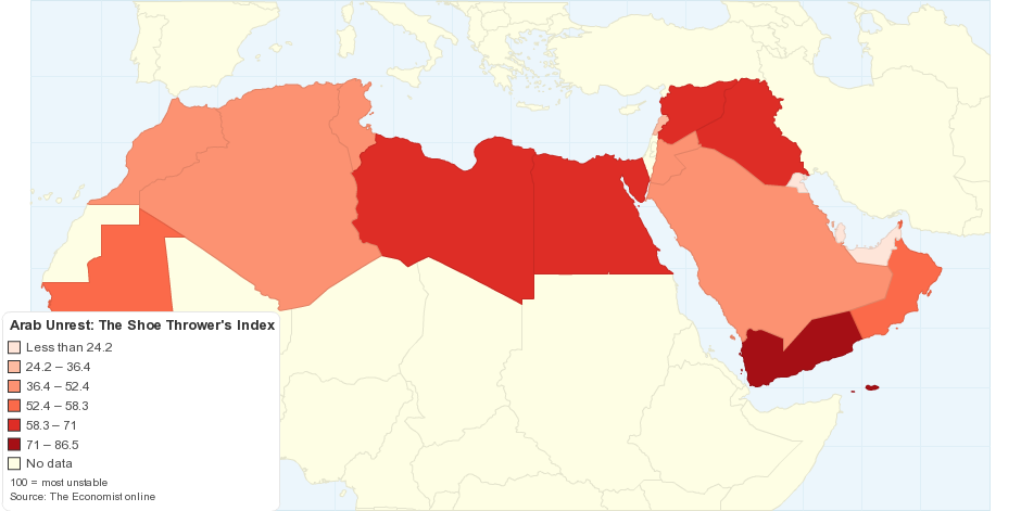 This map shows the Shoe Thrower's Index. The Shoe Thrower's Index is an index of unrest in the Arab world published by the Economist Newspaper Limited.