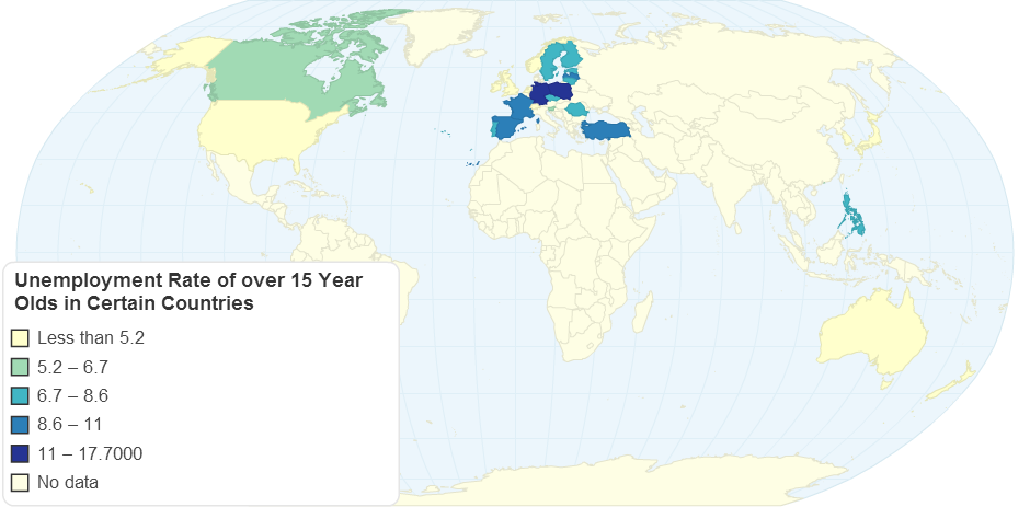 Shows the amount of unemployment from ages 15 and over in some countries as a deveplopment indicator