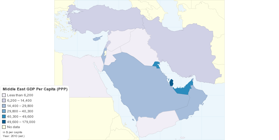This map shows Middle East GDP on a purchasing power parity basis divided by population as of 1 July for the year 2010.