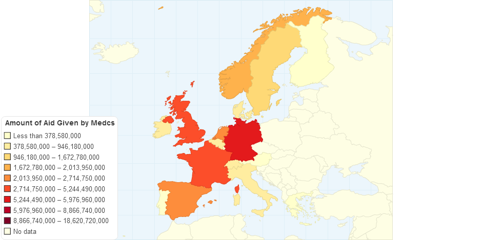A map to show how much aid was given by European countries in 2007. Data from www.chartsbin.com.